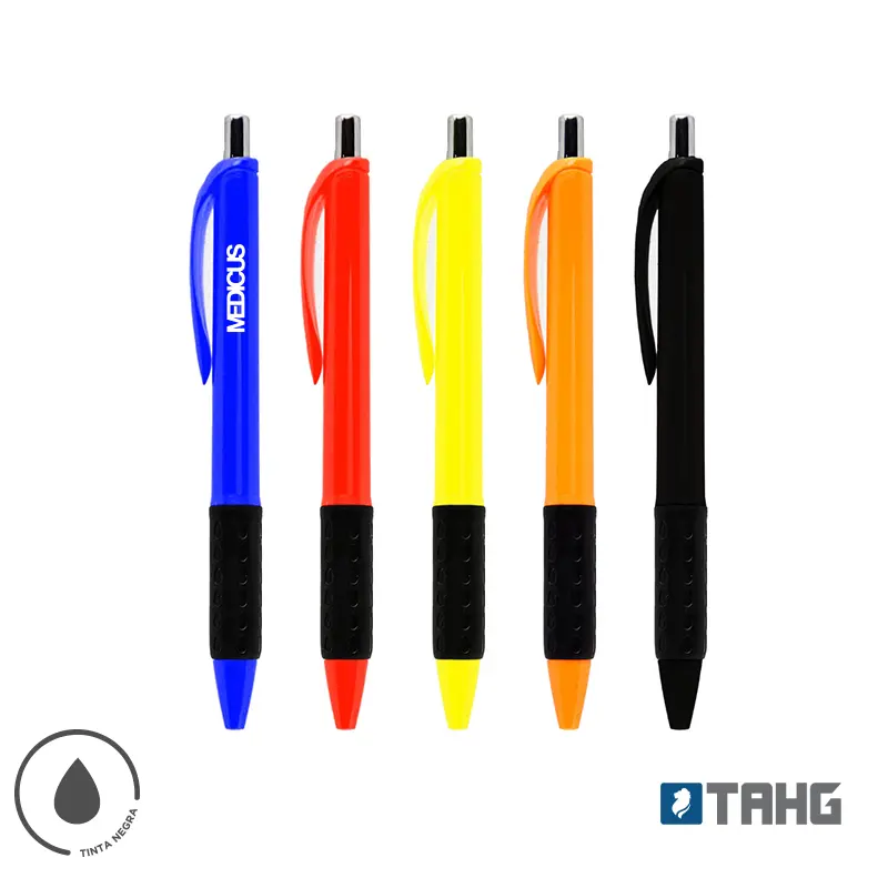 Bolígrafo con cuerpo plástico de color. Grip de goma negro. Pulsador metálico. Retráctil. Tinta negra.