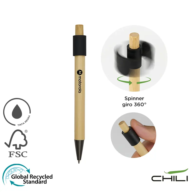 Bolígrafo de bambú y aluminio reciclado. Fabricado con un cuerpo de bambú certificado FSC y detalles de aluminio. Cuenta tinta negra, un diseño sin clip, y una parte superior giratoria, el rodamiento de bolas de alta calidad ofrece un giro suave e interminable, lo que lo convierte en un calmante para el estrés. Es ideal para quienes buscan un bolígrafo funcional y ecológico que también actúe como antiestrés, iniciador de conversaciones o herramienta de escritura diaria.