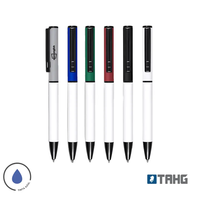 Bolígrafo metálico con mecanismo de giro fabricado en aluminio con recubrimiento de goma para una mejor sujeción. Cuenta con tinta azul alemana y clip metálico. Es ideal para el ámbito corporativo, eventos ejecutivos y uso profesional, aportando elegancia y precisión en cada trazo.