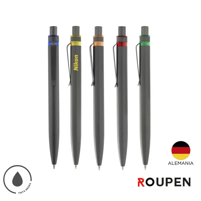 Bolígrafo realizado con aluminio y plástico, funciona con sistema retráctil. Cuerpo de color plata y una banda de color.Tinta negra. Roupen.